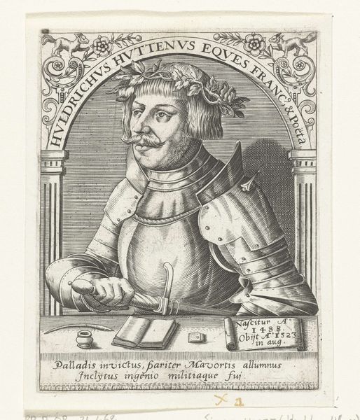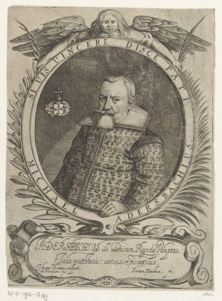 Editor: This is a print from 1608, Adriaen de Grebber’s "Portret van Nicolaas de Grebber." The precision of the engraving is remarkable. What stands out to you in terms of its artistic merits? Curator: Indeed. Consider first the balanced asymmetry: The subject’s gaze draws us in, but then our eyes are drawn across to the cherubic figure on the left. Note how the textures, from the draped curtain to the meticulously rendered patterns of his garments, demonstrate a sophisticated use of line to imply form and material. Observe the framing as well, an embellished rectangle emphasizing containment and a curated view. Editor: It’s almost a theatrical presentation, isn't it? Like a stage set around him. The objects, tools, and fabrics must reveal status as well. Curator: Precisely! They construct a carefully calibrated representation of status. And observe how the lines within the engraving serve a dual purpose—depicting the subject but also directing our gaze. How do these choices affect your perception? Editor: I hadn’t noticed the subtle directives within the image itself! Thinking about the composition this way really adds a new level of interpretation. Curator: By focusing on the formal elements—the lines, shapes, and the way they are arranged—we gain a much richer appreciation. Editor: Thank you. I definitely have a fresh perspective. Curator: And I, perhaps, a reminder to avoid solely interpreting the context without observing the work’s compositional force.