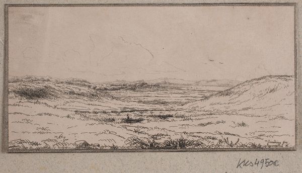 Editor: This drawing, "Heuvellandschap met figuren," or "Hilly landscape with figures" by Arnoldus Johannes Eymer, was created sometime between 1803 and 1818 using pencil and colored pencil on paper. It's quite a muted sketch. What catches your eye when you look at this? Curator: Well, the immediate thing I consider is the accessibility of these materials. Paper, pencil, even coloured pencils – these are relatively common materials. Who had access to them, and how did that access shape the kinds of images produced? A landscape drawing suggests leisure, observation, perhaps even land ownership or a connection to agricultural production. Was this a professional artist, or someone from the landed gentry with time to dedicate to sketching? Editor: That's interesting. I hadn't really thought about access to materials. The 'Romanticism' tag made me focus on the image itself rather than how it was made or who could make it. Curator: Precisely. The Romantic ideal is presented as almost naturally arising from innate talent, but what if it's tied to a very specific set of material conditions? We have to question whether these supposed natural landscapes reflect ownership of land and how the raw materials used became available to the artist. Editor: So, you're saying that understanding the social and economic factors around art-making changes how we see the art itself? Curator: Absolutely. The drawing is not just a rendering of nature but is evidence of labor, economic privilege, and access to both resources and education, even on a modest scale. A different history emerges once we center these factors. Editor: I see, the raw materials tell another story. I'll definitely keep that in mind going forward. Curator: Great. Remember that material conditions matter!