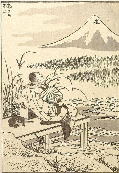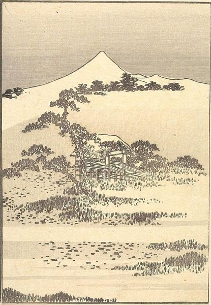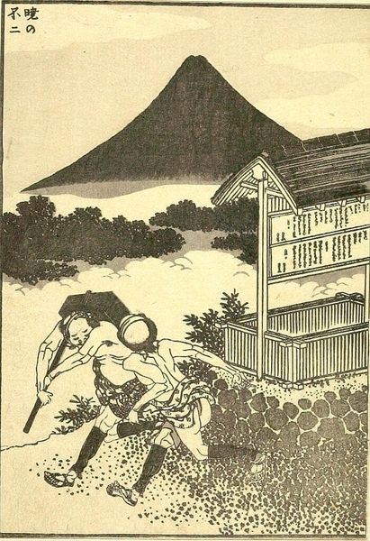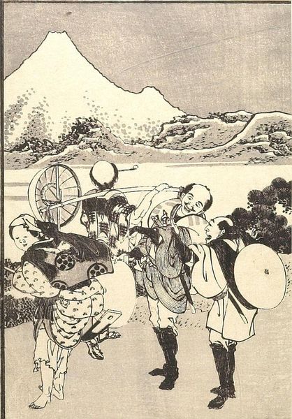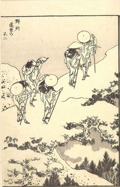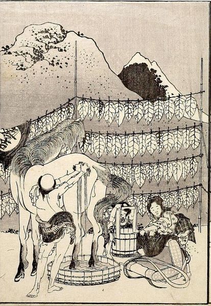Editor: This is Katsushika Hokusai's "The Farmland of Fuji in Kai Province," a woodblock print from his "One Hundred Views of Mount Fuji." I am struck by the contrast between the farmers working and the looming, iconic mountain in the background. What do you see in this piece? Curator: This image speaks to the socio-political context of 19th-century Japan. Hokusai is deliberately juxtaposing the idealized image of Mount Fuji, often associated with power and permanence, with the daily labor of farmers. It questions whose story is being told and for whom. Notice how the farmers are anonymous, almost blending into the landscape. Editor: That’s a powerful point. It makes me wonder about the intended audience and the message Hokusai was trying to convey about social class. Curator: Exactly. By showcasing the commoners' lives against the backdrop of this national symbol, Hokusai subtly critiques the established power structures and elevates the everyday experience. What did you learn from this? Editor: I see the power of art to comment on society. It is not always explicit, but is still very insightful.