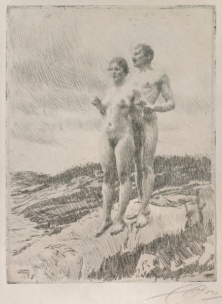 Curator: The way the light dances across the water creates such a soft mood, doesn't it? Almost dreamlike. Editor: Indeed. We’re looking at "Shallow", an etching by Anders Zorn from 1913. Immediately striking is how Zorn coaxes such luminosity out of a traditionally stark medium. The nudes emerging from the water certainly dominate the subject. Curator: For me, the brilliance lies in the suggestive quality of the etched line. Zorn avoids hyperrealism, which is rare when you have figures in landscape settings, allowing our minds to complete the image. The way the reflections break down into pure texture is fascinating, abstracting the familiar. The visual composition almost denies any need for depth. Editor: Absolutely, and I am especially interested in the craft itself: consider the labor that created this image. It wasn't conjured out of thin air! The selection of the etching plate, the skill in wielding the etching needle to build the figures with cross-hatching. This act is recorded labor, isn't it? This tactile act of production infuses the scene with raw materiality. It invites an examination of the division between "fine art" and "the craft" to consider how each frame and influence the image. Curator: A vital observation! Consider too how the nude female form, a historical symbol, finds itself revitalized through the semiotic language of Impressionism. We see the landscape less as a setting, and more like a language of expression, giving it a uniquely sensual appeal, that reflects what those figures actually might mean to the world at large. The women embody light. Editor: Light but they're bound within the realm of tangible stuff. Ink. Paper. Sweat from Zorn's hand pulling this etching forward into its material manifestation, even at its conceptual birth! Curator: Well said. It really forces a new appreciation for both his approach and choices, looking at these tangible factors that might influence a creative eye. Editor: And this approach gives such depth to its artistic expression that lies far beyond simply enjoying what a beautiful etching Zorn managed to manifest out of such "shallow" efforts.