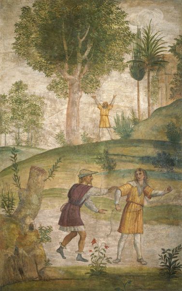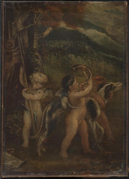 Curator: Albert Pinkham Ryder painted *Dancing Dryads* around 1879, an oil on canvas piece depicting a mystical scene. What strikes you most when you first encounter it? Editor: Its subdued palette and almost ethereal figures create a sense of otherworldly mystery. The brushstrokes seem to melt the forms into one another, blurring the line between the physical and the spiritual. Curator: Indeed, the dreamlike quality is paramount here. The Dryads themselves—nymphs of the trees in Greek mythology—become symbols of nature's hidden power. The collective ritual, their dance, speaks of a communion with the divine and primordial feminine energy deeply embedded within nature. It’s about unveiling the hidden realms of human consciousness. Editor: Precisely. From a purely compositional standpoint, notice how Ryder employs a limited color scheme. The earthy browns and ochres create a unified surface, drawing the viewer’s eye inward towards the figures’ central dance. The shallow depth of field and almost planar presentation emphasizes the two-dimensionality, drawing attention to the surface of the painting as an object in itself. Curator: Absolutely. This is in keeping with the Romantic notion of the sublime. These beings are symbols of powers beyond human understanding, capable of both wonder and terror. Their obscured forms and dynamic motion echo both creative force and untamed wildness. Think how the symbol of a dancer relates to the dance of the cosmos, constantly created and destroyed. Editor: Ryder masterfully handles light and shadow, enhancing this sense of mystery and elusiveness. The areas of high contrast and muted tones don't simply illuminate the figures but invite viewers to question the relationships of mass and void—foreground and background. Curator: And that is the enduring power of this image—the recognition of our connection with natural cycles. We understand that within the depths of nature we might recognize something of ourselves—the feminine divine that lurks just below our human awareness. Editor: Well said! I think through analyzing the painting, viewers might be able to recognize how formal properties are combined in service of symbolic themes. The application of oil paints brings those Romantic themes to life.