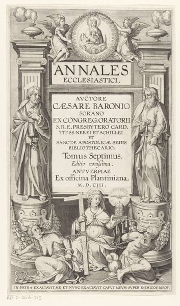 Curator: Look closely at this meticulously detailed engraving, "Title Page for Annales Sacri - First Book," created around 1620 by Theodoor Galle. Editor: My first impression is of intense contrasts, dark and light. The rigid architecture seems to weigh down the cherubic figures above. There is such strong dichotomy. Curator: That tension speaks to the Baroque style that flourished at the time. The engraving, a type of print, served as the introductory page for a religious text. It presents us with the weight and power of religious knowledge being disseminated through print culture. Editor: And those figures flanking the central text - allegorical representations of the Old and New Testaments? What do you think about the institutional framework the artwork implies, the authority claimed here? Curator: Precisely. On the left, “Lex” represents the Old Testament’s law. On the right, the prophet alludes to the prophetic tradition within Judaism which anticipates and prepares the way for Christian teachings, symbolizing the transition and fulfillment in Christian doctrine. The architecture of this composition serves the authority that produces the “sacred annals”. Editor: You've highlighted a visual representation of a historical power dynamic - the superseding of one belief system by another. Is that hierarchy justified? How do the depicted power relations impact those excluded from the narrative, their stories untold or actively suppressed? I mean…the architecture appears so sturdy but what about its foundations and underlying logic? Curator: Absolutely. The image works within a specific socio-political context where religious dogma and cultural power intersect. Consider how printmaking itself advanced during this period. Editor: Well, for me it raises urgent questions about representation. Curator: Yes, and hopefully, the audience also reflects on their position relative to this artwork. Editor: This piece gives a window into how belief systems constructed images of themselves and how power was wielded in the 17th Century. Curator: Indeed. This is just one example of many different forms of artistic expressions throughout history and the questions it can spark are still valuable today.
