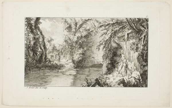 Curator: Here we have Andreas Schelfhout's "Bosgezicht met vijver," or "Wooded Landscape with Pond," from 1852. Editor: It has an intimate feel, like stumbling upon a hidden glade, rendered in such exquisite detail despite being a print. What grabs me immediately is how he captured the dappled light. Curator: He’s really showcasing his etching technique. Note how he varies the line weight to suggest depth and shadow. We tend to elevate painting, but processes like etching—with its own forms of mark-making, and plate preparation involving manual labor and chemical treatment—hold incredible artistry, labor, and skill. Editor: It's a rather romantic perspective too. The framing of the trees creates a quiet haven—the light shimmering on the pond feels very still, very inviting. Almost melancholic. It feels like the memory of a perfect summer day. Curator: You see melancholy; I see industrious craft. This piece, produced as an etching, would have allowed Schelfhout to disseminate his aesthetic widely and affordably. Landscape wasn't just about aesthetic pleasure; it became increasingly linked to Dutch national identity during the 19th century. The ability to produce landscapes for the masses highlights the intersection between art, technology, and the forging of national identity. Editor: Well, regardless, I’m drawn to that serene quality, even knowing its reproducibility—like it’s inviting me to pause, to find a quiet moment. Art isn't just about national narratives, but about resonating on a personal level. Curator: Absolutely. And understanding the method broadens that level. Schelfhout managed to weave emotion and mass production together, speaking both to the Dutch heart and the pragmatic spirit of his era. Editor: I'll take the beauty. It's the place in-between that makes this piece so appealing to me.