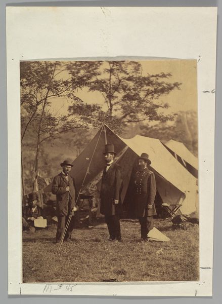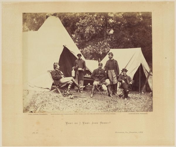 This is a photograph by Mathew Brady, showing the camp of the 22nd New York State Militia in Harper's Ferry, Virginia. Made using the wet collodion process, a glass plate negative would have been prepared, exposed in the camera, and then developed immediately. The tonal range is subtle, and the image itself rather small. The final print is mounted on card, a format known as a "carte de visite," which became incredibly popular during the Civil War. This was an early form of photographic reproduction, with prints made in multiples using contact printing frames. Brady ran a large studio, and the business model depended on sales of such images. They allowed people to keep images of loved ones with them. Consider the inherent qualities of photography, its truth-to-materials indexicality, versus the massive industrial process required to produce them on this scale. The image's cultural significance lies in its depiction of soldiers during a pivotal moment in American history. By understanding the materials, making and context of this photograph, we can appreciate its meaning beyond a simple representation of a camp scene.
