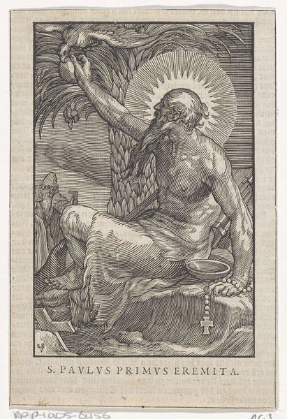 Curator: This is “Heilige Alexandra als kluizenares,” or “Saint Alexandra as a Recluse,” an engraving made in 1644 by Christoffel van Sichem the Younger, currently held at the Rijksmuseum. Editor: There’s a certain raw quality here; you can almost feel the lines cut into the block, creating this stark, devotional image. I see a lone figure, haloed, eyes lifted…it's a study in isolation, even transcendence. Curator: It speaks to the baroque fascination with both piety and the individual soul. The historical Alexandra was a Roman empress who chose a life of religious seclusion. Sichem is contributing to an already popular narrative that intersects with contemporary understandings of feminine devotion. Editor: Consider the act of engraving itself – a repetitive, physically demanding labor to reproduce this image. There's a connection to Alexandra's own renunciation. We often overlook that physical toll; religious iconography, especially when disseminated like this, came from a workshop. Curator: Exactly. The means of production here are key. Sichem’s workshop would have made multiple prints for a growing market of religious images and portraits. The image could serve for private worship or public veneration, influencing religious ideas throughout society. Editor: And what’s she reading? A rather thick book – almost handled like another piece of raw material. I find that really fascinating; how that physical contact with knowledge becomes crucial in these engravings. The rough texture emphasizes labor and direct human engagement with the divine. Curator: Absolutely. That book connects to literacy, which was a developing idea for women’s access in society and their involvement in public discourse. It reveals broader socio-political context; beyond just depicting a saint, Sichem depicts an ideal to emulate. Editor: I hadn’t considered the cultural politics – a saint to emulate, distributed in the public sphere. I’ve now learned more about the layered material choices embedded within this solitary image. Curator: And seeing it within a broad, complex moment in social and religious history adds new dimensions. I appreciate seeing the materiality, its implications beyond religious art and piety, in order to consider this from new perspectives.