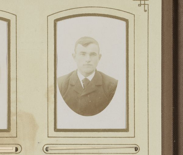 Editor: Here we have "Portret van een jonge man," or "Portrait of a Young Man," made around 1874 by the Gebroeders IJpma. It’s an albumen print, so it's a photograph within a larger print album. I'm immediately struck by how serious he looks; what stands out to you? Curator: It’s interesting to consider what a portrait like this signified in 1874. Photography was becoming more accessible, but a formal portrait still represented a claim to identity and status. Who was this young man, and what did he hope to convey? Was this portrait intended for personal remembrance or for public consumption within his community? Editor: That's a great point! I hadn't thought about the statement it makes. How would this image have circulated, do you think? Curator: Exactly! And it prompts questions about representation. How does the very act of creating and displaying this image participate in the construction of masculinity at the time? Are we seeing a performance of idealized manhood? What class dynamics might be at play in commissioning such a portrait? It makes you wonder about the social currency of image-making. Editor: It's a very different way of looking at a simple portrait. Thank you for the insightful perspective. Curator: Indeed. By considering the broader context, we can unearth some interesting historical narratives.