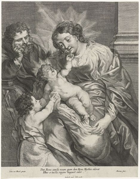 Editor: This is "The Holy Family with Saint Elizabeth and the infant Saint John the Baptist" by Jan Witdoeck, dating from 1635 to 1653. It's a print, a sort of detailed drawing, and there’s something so… grounded about the composition, despite the religious subject matter. What strikes you about this piece? Curator: What I find fascinating is how Witdoeck utilizes the print medium itself. Think about the labor involved: the meticulous engraving, the multiple impressions, the dissemination of imagery. It takes what was previously reserved for the wealthy patron into mass production. How does that shift affect our perception of the subject matter, the Holy Family? Editor: I guess it democratizes the image? Suddenly, this sacred scene is available to a much wider audience, impacting their daily life. Does the material—the paper, the ink—play a role in understanding the art’s reception? Curator: Absolutely. Consider the accessibility of prints. They are easily transportable, allowing for the circulation of ideas and artistic styles. Furthermore, prints are relatively inexpensive. They facilitate devotion through affordable images accessible to the masses. Also, notice the classical architectural background; this relates to notions of value: how does the print function as a valuable commodity in and of itself? Editor: So, it’s not just about the image; it’s about the process of making it, its accessibility, and its presence as a physical object in people's lives. I had never considered how much the means of production affect meaning. Curator: Exactly. By focusing on the materials and modes of production, we reveal how art actively participates in shaping social values. Consider what changes the reproducibility causes versus a one-of-a-kind painted object. Editor: That's a perspective I hadn't really considered. Thanks, I'm beginning to grasp it, and can see that context can change everything!