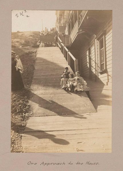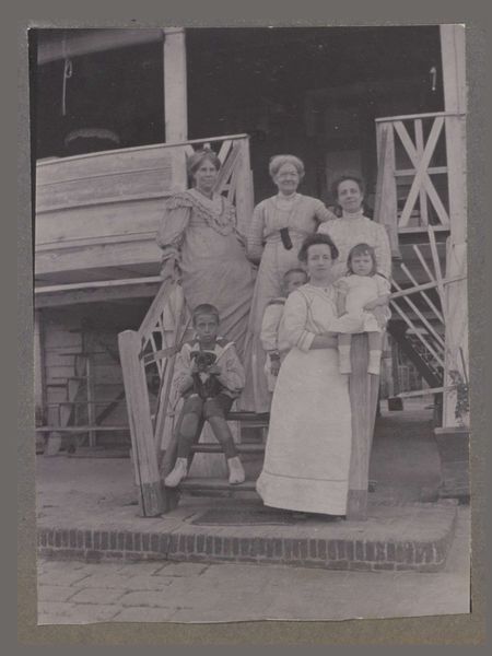 Curator: This intriguing photographic print, titled "Shanghai Installation," is part of Geldolph Adriaan Kessler’s collection here at the Rijksmuseum, dating to before 1908. Editor: My first impression is one of industry and perhaps transience. The slatted floor, the open structure...it feels like a moment caught in the middle of some significant work being done. Curator: Indeed. Let's consider the image's components. The central focus appears to be workers handling a series of objects—possibly ice blocks—under a large open-sided structure. What do these elements evoke for you? Editor: Immediately, I see a powerful symbol of modernity juxtaposed with a necessity of older times—ice as a means of preservation, which becomes quite poignant if we link this to a rapidly changing urban center like Shanghai at the turn of the century. The smoke stacks visible in the background reinforce this, as symbols of modernization transforming China's material culture. Curator: I’m drawn to the stark contrast between the rigid geometry of the wooden beams and the softer, organic shapes of the workers. It brings to the fore questions of labor and its organization within this emerging industrial context. The repetition of the ice blocks also highlights mass production and the developing infrastructure. Editor: Agreed, but what is equally striking to me is the stoic representation of the figures themselves. Notice how little we see of their faces. Instead, we are left to interpret the meaning and experience via symbols: of labor, production, progress...The symbolism here transcends simple portraiture; it embodies the broader themes of Chinese cultural assimilation with modern Western economic influences. Curator: It's fascinating how a simple photograph can unravel layers of material reality and historical context. Consider the limitations of early photography; the long exposure times would necessitate subjects holding still, but the composition chosen elevates these ordinary tasks to almost staged moments, telling complex tales of industry, labor, and urbanization. Editor: Exactly. And to me, the photograph operates almost like a visual poem, capturing those nuances of Shanghai's transformation at the time through its striking visual symbolism. The convergence of tradition and the onslaught of modernity depicted is a poignant, thoughtful study on its people as a modern world power.