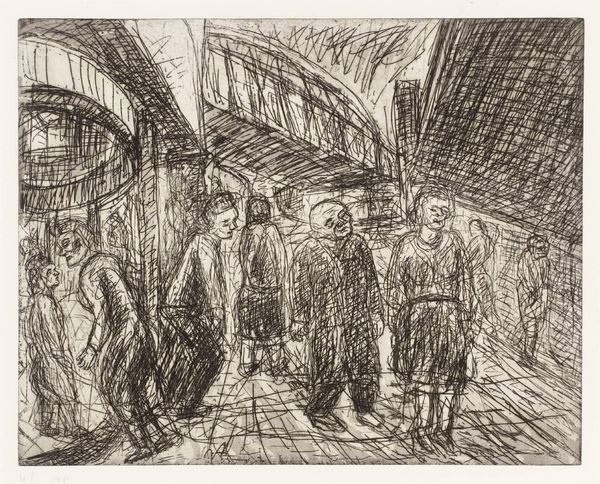 Curator: This is Leon Kossoff's etching, "Outside Kilburn Underground [stage proof]". There's no definitive date associated with it. Editor: The heavy lines give it such a claustrophobic feeling; like the weight of the city is pressing down on everyone. Curator: Kossoff repeatedly returned to similar urban scenes. His focus was always on capturing the everyday experiences of Londoners. Editor: Look at the labor implied in that mark-making, though! The sheer physical effort to create that dense web of lines to build up the image. Curator: And this, remember, is a "stage proof", so it's a working document, revealing the process of artistic development. Editor: Right, a raw glimpse into his methods, the materiality of the lines themselves creating a sense of place. Curator: It's a fascinating insight into the artist's vision and the social context he sought to represent. Editor: An unflinching depiction of working-class life rendered through intense physical labor. I see a direct connection.