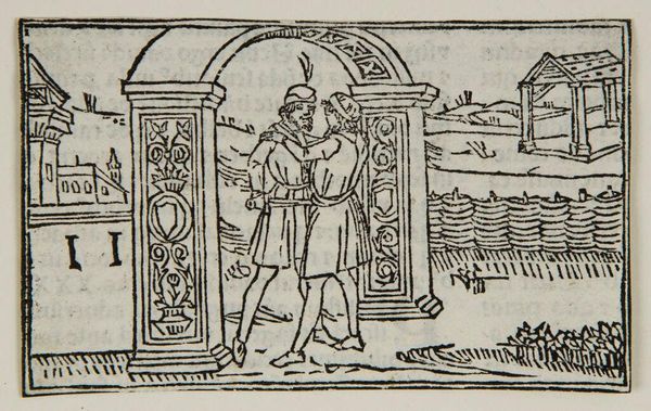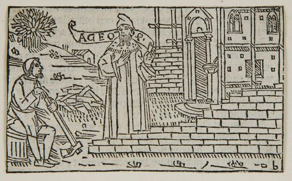 Curator: Here we have Illustration XXXIII, an anonymous work held here at the Harvard Art Museums. Editor: My initial impression is that it appears deceptively simple, a woodcut almost like a medieval morality play in miniature. Curator: The figure of Josee points heavenward, seemingly instructing or guiding the woman and children—the city behind them hints at a potential destination. Editor: I'm drawn to the city itself. Those stark lines create a formidable, almost oppressive image, especially given its juxtaposition with the familial scene in the foreground. It feels very symbolic. Curator: Indeed, the woodcut medium underscores the stark choices faced by marginalized communities. The contrast here highlights systemic barriers and the importance of guidance in navigating oppressive structures. Editor: The figures all face different directions, each seeming to suggest different pathways, an intriguing tension between fate and free will in the face of those formidable city walls. Curator: Precisely, and perhaps it's this duality that offers a space for agency—for the possibility of rewriting one's narrative despite the prevailing structures of power. Editor: It's a potent reminder that the stories we tell are embedded in larger visual and cultural legacies.