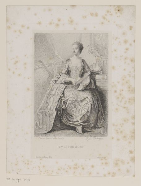 Editor: This engraving, titled "Estampes de costumes, 1744, Pl. 4 (507)" by Charles Grignion I, showcases a woman in an elaborate dress. The detail in the fabric is quite impressive! What can you tell me about the historical implications of the fashion on display? Curator: What strikes me immediately is the rigid structure beneath the fabric. The clothing represents more than mere decoration; it signifies societal expectations and constraints imposed on women during the Rococo era. Consider how such attire limited mobility and independence. Editor: It’s interesting how the clothing itself becomes a sort of symbol. How would you connect this visual representation of gender and class to broader discussions around women's rights? Curator: We can analyze how fashion was utilized as a tool of control and how women navigated, and sometimes subverted, those limitations. How do you interpret her stance, her gaze? Do you find a sense of agency or merely a passive acceptance of her role? Editor: She looks serene, but perhaps there's also a hint of defiance? It’s hard to tell. This conversation made me think about how clothes have always been used as a way of either fitting in or standing out in society. Curator: Precisely. Understanding these visual cues enables us to decode the complex relationship between the individual and the structures governing her existence. Editor: I learned so much by looking at what might have seemed, on the surface, a mere fashion plate. Curator: Exactly. And fashion can act as a reflection of its cultural epoch.