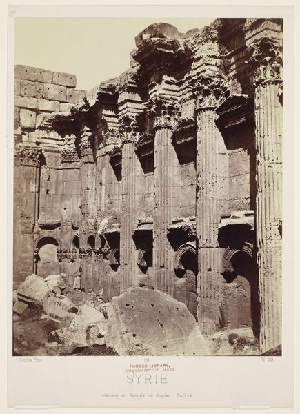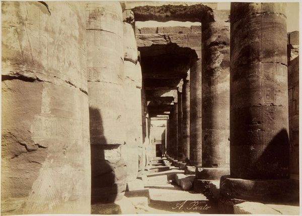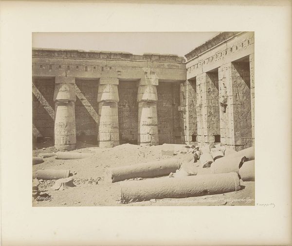 Curator: Take a moment to consider this image from 1867: Gustave Le Gray’s "Temple of Edfu," now housed here at the Met. Editor: Well, the first thing that strikes me is the stillness. It feels heavy, monumental… but also, somehow, fragile, like it could all crumble if you shouted too loud. Curator: Le Gray’s work occupies this fascinating intersection of art, documentation, and politics. The Temple of Edfu, dedicated to the falcon-headed god Horus, was a popular subject for early photographers venturing into Egypt, drawn by the colonial interest of the time. Editor: Do you feel it was more documentation than art? Because to me, the light – the way it carves out those columns and throws deep shadows – that’s pure drama. And those tiny figures in the foreground! They feel like they are swallowed by history itself. Curator: It is about representation, about access. Le Gray, using albumen prints and perhaps a waxed-paper negative, controlled light and exposure to produce these scenes from this historical site. What this implies is not just the portrayal of monuments, but also the control of narratives around Egypt’s ancient power. Editor: So, it's more than just a pretty picture then. These images of Egypt became part of how Europe understood – and controlled, perhaps? – that part of the world. I am captivated by how different it all must have looked at the time, or how many things went into constructing these photographs! Curator: Precisely. The composition, with its stark contrasts and monumental scale, reflects that drive to categorize, to archive, but perhaps not understand completely. It becomes an exotic vista filtered through a colonial lens. Editor: So, beyond the impressive architecture and careful composition, Le Gray's photograph holds layers of meaning – of power, representation, and the sometimes problematic act of looking itself. It's something to contemplate! Curator: Indeed. When viewing this work by Le Gray, remember that this historical landscape prompts a crucial and difficult conversation around the nature of representation.