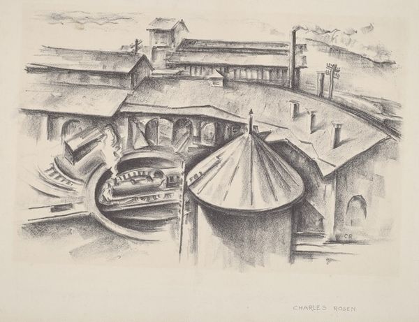 Theo Ballou White created this print, "Water Tank Hill - Boulder Dam" using black ink on paper. The composition presents an imposing water tank, centrally positioned atop a stark, terraced hill, an arrangement that immediately draws our eye. The use of stark black and white contrast evokes a sense of drama and emphasizes the geometric forms. White’s strategic use of light and shadow to articulate form is evident. The graded tones suggest the curvature of the tank and the angularity of the hills. The dark, brooding sky adds a layer of intensity, contrasting with the stark white buildings at the base. This interplay serves not only an aesthetic purpose but also invites us to consider the underlying power dynamics inherent in landscape and infrastructure. Ultimately, the print challenges fixed meanings of progress and environmental impact, inviting ongoing interpretation.