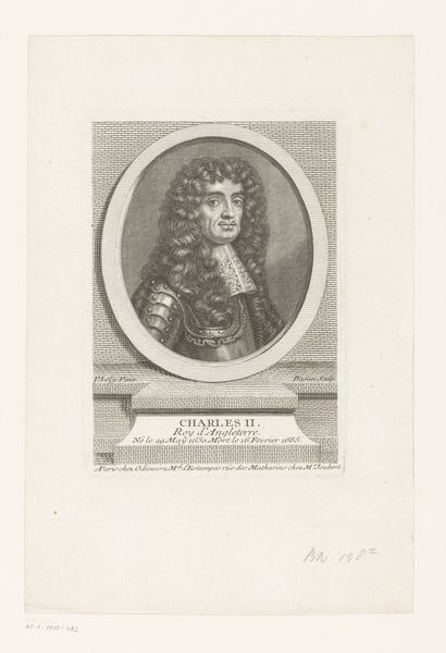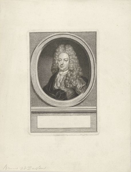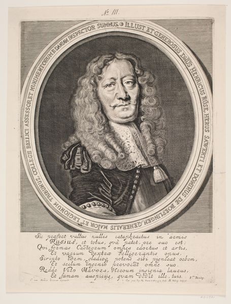 Editor: This is a portrait of Anna Genoveva van Bourbon-Condé, Duchess of Longueville, made between 1744 and 1755 by Pierre Filloeul. It's an engraving, which gives it a wonderfully crisp and delicate feel. The subject’s gaze is incredibly direct, but there is also an interesting ambiguity in the details… What catches your eye in this work? Curator: The ambiguity you noticed is interesting because it reminds me how portraiture back then was about setting out an idea, even an ideal, of the person being depicted. Notice how the frame around the oval mimics a jewel setting? This tells us this image wasn’t simply about representation. Editor: I see what you mean, it's not *just* a portrait. The details surrounding the image seem significant. Curator: Absolutely! Think of the text accompanying the image – names, titles, dates – all framing her identity within a historical context. The whole thing acts as a historical marker, almost like an official record. Do you see how the artist’s choices underscore that intention? Editor: The details really highlight her status and the engraving becomes more than just an image; it’s a statement about her life. It makes you think about who controlled these narratives and images! Curator: Exactly! It raises questions about representation and how identities, especially of powerful women, were crafted and disseminated through art. Considering the Baroque era’s love for the theatrical, perhaps Filloeul created a miniature stage for her, turning a portrait into an unfolding narrative. Editor: This has completely changed my perception; I see it not just as a picture, but as a carefully constructed statement. Thank you! Curator: And thank you! Now I'm picturing Anna Genoveva herself carefully considering how she’d like to be seen!