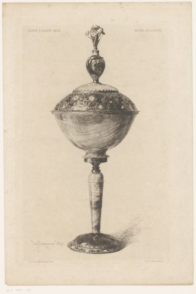 This is a print of a cup by Wenzel Jamnitzer, an artist working in the 16th century. The cup is an ornate object, reflecting the Renaissance era's values and the status of its owner. The intricacies of the design speak to the era's increasing focus on opulence and refinement. It’s difficult for us to imagine an object so precious, used in the everyday. The materiality of the cup is interesting: whose hands would craft, own, and use such an item? Its existence prompts us to consider the socio-economic structures of the time, of the intersections between art, labor, and wealth. This cup is both a celebration of beauty, and a reflection of power dynamics. It encourages questions about who gets to create, who gets to own, and what stories these objects silently tell us about the world of then, and of now.