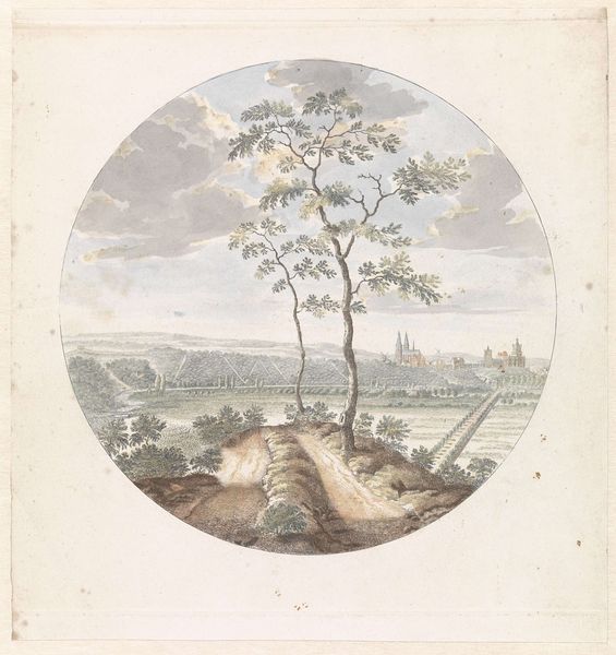 Editor: Benjamin Champney's "Scene on the Connecticut River" is a delicate drawing. I'm drawn to the way the circular composition frames the landscape. What can you tell me about it? Curator: Notice the paper itself – likely mass-produced, reflecting the growing accessibility of art materials in the 19th century. How might this impact our understanding of landscape as a commodity? Editor: A commodity? Curator: Yes, consider the social context: increased industrialization, westward expansion. This image could be consumed as a symbol of progress, or perhaps a romanticized vision masking the realities of labor and resource extraction in the region. Editor: So the materials and the scene together tell a larger story. Curator: Precisely. The ease of producing and distributing images like these allowed for widespread consumption of landscape imagery, shaping perceptions of nature and its resources.