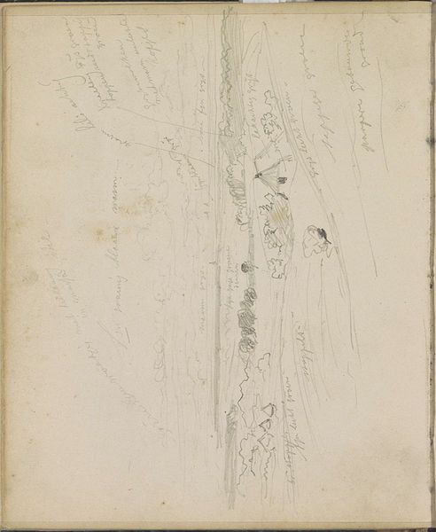 Curator: This sketch is called “Huis tussen de bomen,” or "House Between the Trees," made sometime between 1839 and 1872 by Johannes Tavenraat. It's a pencil drawing on paper, currently residing here at the Rijksmuseum. Editor: It feels incomplete, or maybe just captured in a fleeting moment. Those hurried pencil strokes create a sense of mist, of transience, almost like I'm viewing a half-remembered dream. Curator: Well, Tavenraat was definitely working in a realist style, focusing on landscapes, which often involved sketching *en plein air*. Think about the logistics. Carting your paper, pencils – even a stool, maybe – out into a wooded area. I mean, you wouldn't want to drag your whole studio outdoors. This makes it more immediate, raw even. Editor: Makes me consider where that paper came from, too. Nineteenth-century paper mills weren’t exactly paragons of environmental virtue. Imagine the labor and material involved to create the ground for the sketch, let alone the work to bring forth this image from the pencil, too. It’s a landscape built on extraction. Curator: A landscape both literally represented and materially reliant on extraction. I wonder if Tavenraat was conscious of that tension as he worked. Though, his main focus likely revolved around depicting natural light. Look how he uses faint lines to suggest atmospheric perspective, to define distance and depth, just subtle shifts in shading… Editor: Sure, there's something to the ethereal rendering of light, but these hasty strokes have an almost anxious quality about them. Look, for instance, at the scribbled shading defining the trees – this suggests the rapid, almost frantic motion needed to seize an atmosphere and effect of light as it rapidly changed across the Dutch landscape. It brings me to think of how all landscapes carry the evidence of their making, both culturally and environmentally. Curator: Perhaps. Or maybe that very tension, between the quiet serenity he tries to capture and the frantic effort of capturing it, speaks to something deeper about our relationship with nature. After all, we build houses *between* the trees, we don’t truly belong to them. Editor: Indeed, and it's in those very contradictions, embedded within the materiality of even the simplest sketch, where we can uncover new ways to view a picture like "House Between the Trees". Curator: Absolutely. Art provides more than mere image, it contains the processes, materials, and history involved in its creation, all captured through one person’s vision.