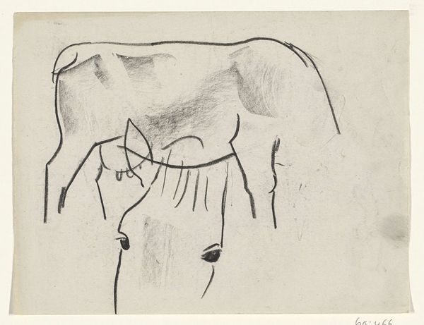 Curator: Leo Gestel rendered this graphite drawing, "Two Horses," sometime between 1891 and 1941. It's currently held at the Rijksmuseum. Editor: There’s a certain unfinished energy to it. The lines are so spare, so economical, yet they capture the powerful essence of these animals. It’s like looking at an echo of a horse rather than a detailed depiction. Curator: Absolutely. Gestel's work often navigated the emerging currents of abstraction. Given the time period in which it was created, that aligns him with broader anxieties of modernization where even traditional forms were disrupted by changes to societal relationships. How might these animals' representation serve a cultural understanding of labor at this moment, given they become obsolete through mass automation? Editor: Well, horses are laden with symbolism. Power, freedom, even untamed passion. The simplified forms lend the animals an archetypal quality. Almost like equine figures one might find painted on cave walls, or from friezes recalling earlier Classical forms in modern media. There's a primal energy about these two, despite the relative calmness they have, close in their physical space. Curator: But consider the implications of that "untamed passion." In Gestel's Netherlands, we find a society still reckoning with rapid urbanization. These horses, confined to a sketch, might represent both a yearning for a lost pastoral world and a patriarchal insistence to domesticate what defies control, with inevitable limitations and, frankly, abuses. Editor: That’s a powerful reading. Perhaps that is exactly where it pulls us in–an exploration of what happens to the symbolism of work horses from Classical, and Early Modern use to today? The interplay of strength and vulnerability is certainly palpable through the image here. Curator: Gestel has left us with an intimate look at two animals caught at a point of both reverence, with links to Classicism, and historical tension as they transition into abstraction. Editor: A powerful visual meditation on symbolism and changing times that leaves me thinking deeply.