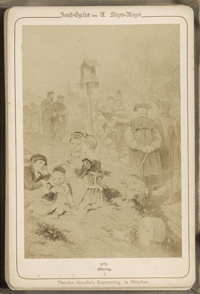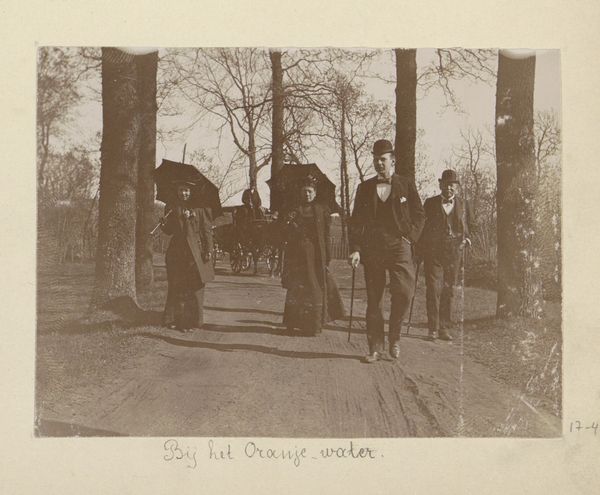 Curator: I'm struck by the way the light catches the donkey’s harness in "The Donkey Party; The Upper Lake" by James Knight, dating back to the mid-1850s. It’s a gelatin silver print currently residing at the Metropolitan Museum of Art. What's your initial take on it? Editor: It evokes a sense of quiet Victorian gentility. The donkey, cart, the stillness of the lake... It’s all rather dreamlike, wouldn’t you agree? What symbolic roles do the figures’ placements and gestures hold for you? Curator: The arrangement feels almost performative. Consider the labor involved – the physical act of arranging the donkey, the cart, and the people – juxtaposed with the "Upper Lake" image. Was this some specific event the photograph sought to replicate, or a completely artificial fabrication for purely representational purposes? Editor: Absolutely. The grouping presents the viewer with archetypes, almost. The sober man in a top hat could represent responsibility, those dark garbed woman nearby may stand for something far less explicit: mystery. They form something akin to an allegorical tableau. Curator: Fascinating to see you immediately zeroing on allegorical notions in the work. I find the photographic processes themselves to be loaded, since the image quality achieved is dependent on factors like the weather that simply couldn't be fully controlled in the 1850's. The material challenges photographers had to overcome! Editor: That's certainly a powerful idea – these photographs weren't designed to look so dark or heavily-toned, as in today's age. The photographs reflect the technology of the time and the expectations it established about realism, influencing future viewers to read photographic cues. In some ways, that helps contribute to their ongoing myth-making quality today. Curator: Precisely! Examining those material and economic production pressures of the work really unlock further interpretations about Knight's intention behind them. Editor: For me, it highlights how we, through interpreting the symbolism of each scene, build layers of meaning across eras, while it all stands on a foundation that begins with, for you, the artist’s labour. Fascinating to hear both perspectives. Curator: Agreed! The visual weight of it all truly makes it thought-provoking, when taken in concert.