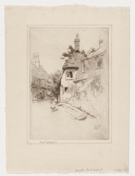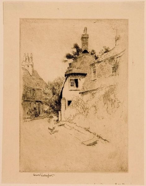 Curator: I’m struck by the delicate nature of this work. It feels quiet, almost wistful. Editor: That's a fitting impression. What we’re looking at is “Houghton Road,” an etching by Sears Gallagher. Gallagher was quite prolific, especially in New England, producing drawings and prints into the early 20th century, often of humble locations. Curator: There’s something so familiar and archetypal about it, even though I've never been to Houghton Road. The thatched roof is nearly dissolving into the overgrowth. Almost like it's hiding secrets. Editor: You picked up on that element perfectly. The thatched roof, for instance, is a very potent symbol across cultures—shelter, certainly, but also community and tradition. They are representative of simpler ways of life. Curator: I notice, also, how the line work around the houses is looser. Whereas the textures on the thatching are quite controlled and intricate, lending to the impression of natural, but temporary existence against constructed human life. Is that an intentional contrast do you think? Editor: Absolutely. I believe Gallagher is contrasting permanence against a world he saw disappearing. His landscape art often shows us the meeting points between an old way of rural life and a new century dawning in industry and society. The drawing becomes his way to conserve elements that others discard as outmoded or mundane. Curator: So, this simple scene acts as both a landscape and an exercise in visual preservation. This emphasis allows us a glimpse into society's development into urban life. Editor: Exactly. The cottages themselves act almost as vessels. Holding all those ideals from past lives we have discussed. The humble home becomes the grounds of heritage. Curator: Seeing it that way enriches the picture beyond just a depiction of a place, I had only considered as one landscape previously! Editor: Which makes it even more remarkable that such grand and compelling cultural sentiments can exist in this humble rendering of "Houghton Road."