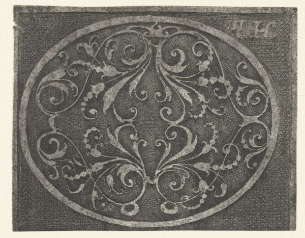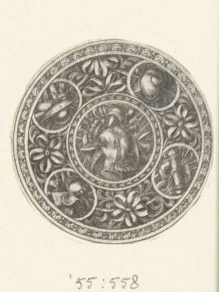 This print, titled "Schaal met zeedieren en moresken," features an anonymous maker who used the technique of engraving to create the depicted image. The print's intricate details and use of shading highlight the engraver’s skill, a tradition with a rich history linking craft and fine arts. The central motif of sea creatures suggests a connection to maritime culture, perhaps reflecting trade and the importance of the sea in society. The elaborate moresque patterns bordering the composition further suggest a possible cross-cultural dialogue in the work’s design. Consider the labor involved in creating such a detailed print: each line carefully etched to build up the overall image. This was likely produced for a consumer audience, demonstrating the rising forces of production during the time it was made. Examining this print, we can appreciate the significance of material, process, and context in understanding the full meaning of an artwork. The print challenges traditional distinctions between fine art and craft, revealing the social and cultural significance embedded within its creation.
