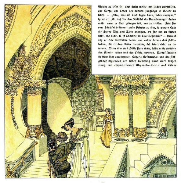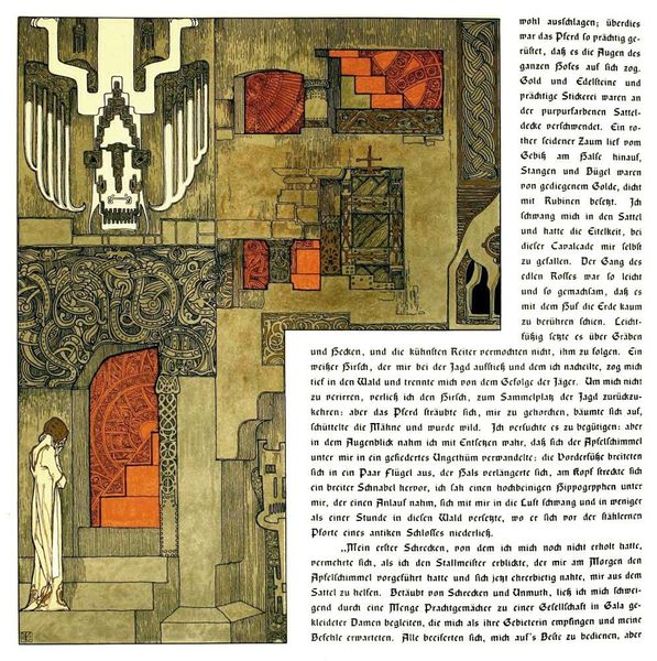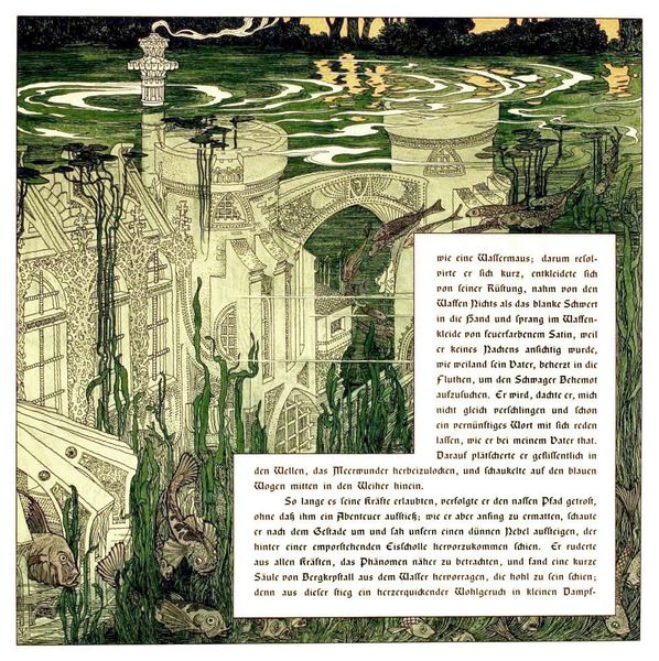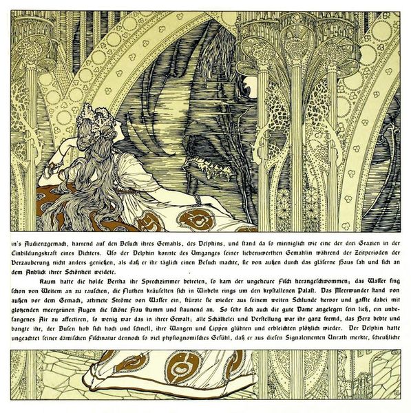 Heinrich Lefler made this illustration, "Die Bucher Der Chronika Der Drei Schwestern 14," featuring dense Art Nouveau decoration, sometime around the turn of the 20th century. Lefler’s highly stylized image participates in a broader artistic effort to revive medieval aesthetics and mythologies. The turn of the century was a moment of intense nationalism, especially in Germany and Austria. The architecture, the stylized lettering, and the symmetrical composition contribute to the feeling of a constructed Germanness. The image also suggests the influence of the Vienna Secession, a group of artists interested in the integration of the arts. By combining architecture and illustration with mythological subject matter, Lefler promotes a vision of art that is intertwined with national identity. To better understand this image, we might look at how the art market helped promote certain kinds of images, or how museums and world fairs presented national identities. We might consider how the turn of the century was a period of both great optimism and great anxiety about the future of Europe.