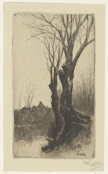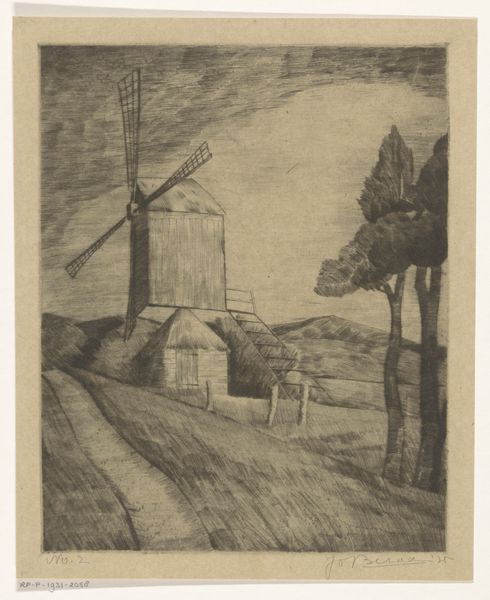 Curator: Viewing Jo Bezaan's "Hooischelf" from 1929, my initial sense is one of quiet desolation. A stark, grayscale palette emphasizes the harshness of the rural landscape. Editor: Indeed. Before us we have Bezaan’s rendering of haystack silhouettes near farm buildings. A humble etching, masterfully utilizing the graphic, almost architectural linearity made available through the technique. It emphasizes shape and compositional harmony over any form of pictorial narrative. Curator: I'm struck by the clear delineation of space – the fence visually anchoring the foreground and the structures and pale moon creating depth in the background. What’s especially striking to me is the material presence of those stacks, so realistically capturing how farmers preserve food for their livestock and the role of those constructions for the community in pre-industrial agricultural times. Editor: Consider too the social context. A realist landscape from this period cannot simply be about the objective truth of a view; it is an essay on working-class environments. Every scratch of the etching tool across the plate signifies labor. The rough texture speaks to a specific, almost haptic engagement with material conditions, bringing us a feeling for those conditions that only looking at it with intention could expose to us. Curator: A persuasive analysis. It prompts one to think about labor investment: what type of labour makes this kind of representation possible? And the relationship between printmaking and dissemination. Does this humble rural scene gain value by being distributed via mass production of prints? Or perhaps, what kind of person or class of persons is meant to engage this material – not necessarily ‘art’ – image. Editor: Precisely, the implications ripple outward. I wonder how our audience might be provoked into thought and questioning of the hierarchy still pervasive between art making and so-called ‘craft’. It is perhaps the inherent skill we find in these subtle strokes and this kind of representation that is capable of bridging that very social and material divide. Curator: On the surface, a simple realistic depiction, but clearly imbued with profound compositional considerations and social meanings when one really takes the time to consider its textures and material form. Editor: Indeed. This prompts a renewed appreciation for an art form that privileges technical expertise and process to communicate its vision to wider society, a crucial link of production.