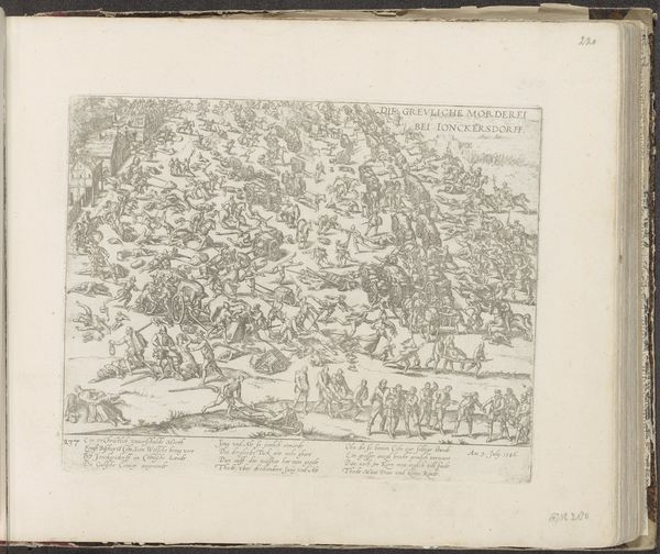 Curator: Look at this etching, "The Battle of Nieuwpoort, 1600," created between 1600 and 1602 by Frans Hogenberg. It's a history painting, rendered in ink. Editor: It’s chaotic! Tiny figures locked in conflict spread across the landscape like an invading swarm. I see ships, fortifications...the composition itself feels agitated. Curator: Consider Hogenberg’s labor, the deliberate act of etching—a process rooted in skilled handiwork. This wasn't about singular genius; prints facilitated dissemination of knowledge to a burgeoning public, influencing opinion. Think about the paper too—where did the materials originate? Who produced the ink? What sociopolitical conditions enabled its circulation? Editor: That's all relevant, but let's not overlook how the Mannerist style informs the chaotic feeling. The landscape's recession feels compressed, amplifying the sense of frenzy, the density of detail, the lines...they draw my eye across a tapestry of conflict. The placement of light and dark creates visual texture that reflects the disarray of warfare. Curator: Absolutely. Yet, knowing this print circulated amidst the Eighty Years' War alters our view. Hogenberg didn't just create an image; he fashioned propaganda. The availability of mass produced images had everything to do with a shifting political environment. How did these visuals help the Dutch Republic shape its national identity, even in marketplaces? The relationship between maker, viewer, and production means informs how this art functioned then and how it should be understood now. Editor: But by studying the formal choices, by acknowledging the use of linear perspective to map military positioning, the deliberate use of hatching to describe textures of war, the composition—we can see how Hogenberg conveys information effectively but also elicits specific responses through visual techniques. Curator: True. However, the intention of an individual artisan exists within a much broader web. We need to investigate the social, economic, and even ecological implications surrounding its production, circulation, and consumption. Editor: Still, by isolating the elements within its visual field, the way shapes repeat and relate...a clear message emerges! But I admit there's deeper richness as well when the picture is expanded to a comprehensive survey of process and labor. Curator: Indeed. Ultimately, considering the intertwined layers gives us richer ground for appreciating both craft and intent.