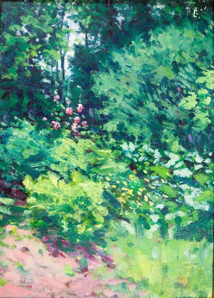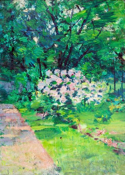 Curator: This is Denman Waldo Ross’s “Landscape with Tree and Pink Flowers,” currently residing at the Harvard Art Museums. Editor: Oh, this feels like a memory. Like a half-remembered summer afternoon under a canopy of green. Curator: The tree, stark and central, acts as a visual anchor amidst the fluid brushstrokes, doesn’t it? It’s almost primal, a recurring motif in our collective visual language. Editor: And those pink flowers! They’re like little bursts of joy scattered around the base, defying the slightly somber mood of the forest. A hint of rebellion, perhaps? Curator: Ross was deeply interested in color theory. These pinks, strategically placed, could function as emotional or even spiritual signifiers. Perhaps they are the promise of renewal? Editor: Maybe it’s just a pretty day. Sometimes, a flower is just a flower, right? Curator: Perhaps. But artists often imbue even the simplest forms with deeper meaning, tapping into our shared visual history. Editor: True. Still, I think I’ll stick with the pretty day. It’s a nice thought. Curator: And a perfectly valid interpretation. After all, art speaks in a language of feeling as much as of intellect.