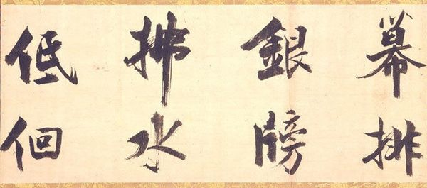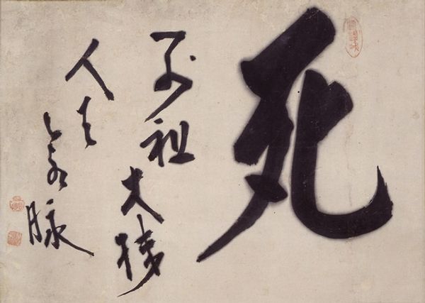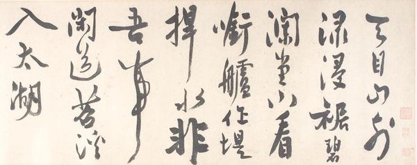 Curator: Looking at this piece, I'm immediately struck by its sense of fluidity and motion. The thick, dark ink against the warm paper creates such a striking contrast. Editor: Indeed. What we have here is a work entitled "Calligraphy" by Kogan Gengei, rendered with ink on paper. Given the artwork and the information we possess, dating this piece proves rather difficult, yet understanding its artistic intentions and broader context is within our reach. Curator: Right. Focusing on its formal qualities, the line work really grabs my attention. You can see the artist's control—or perhaps the deliberate lack of it—in the varying thickness and the way the strokes both define space and blur into it. What is it saying in cultural terms? Editor: Calligraphy, particularly in the East Asian tradition, has never been purely about conveying semantic content. It is a profoundly embodied practice linked to philosophical ideas of self-cultivation and is inseparable from concepts of "ki" – the vital energies. The characters themselves become almost secondary. This becomes a form of visual expression that emphasizes line, composition, and the artist’s individual style within traditional constraints. Curator: I see that embodied energy in the almost frenetic quality of the largest character— it looms so intensely. And what do the individual glyphs mean, if that isn’t imposing too literal a demand? Editor: If we decode the symbolic level, the artwork presents us with traditional East Asian script and associated sentiments. In classical and popular East Asian Culture, one will expect themes of prosperity, harmony, and natural beauty in such artworks. The role of calligraphy is often found as the perfect expression of personal integrity but is also highly marketable and valued for its spiritual content. Curator: Absolutely. The entire arrangement pulses with artistic intention and socio-cultural positioning. Editor: Examining the convergence of ink, paper, line, intention, spirit and content has been rewarding. Curator: Yes, considering the rich cultural and visual qualities makes a fascinating exploration.