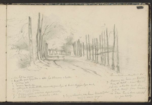 Editor: This is "Boslaan," a pencil drawing from 1873 by Johannes Tavenraat, currently housed in the Rijksmuseum. It's a fairly simple sketch of a tree-lined road. I'm struck by the contrast of light and dark. What catches your eye when you look at this piece? Curator: Formally speaking, I’m immediately drawn to the manipulation of space. Note the linear recession created by the converging lines of the trees, drawing the viewer's eye towards that diffused light in the distance. Consider how the varying pressure of the pencil evokes a sense of depth. Are you sensing a hierarchy within the composition? Editor: Hierarchy? Well, the road definitely leads to a focal point, and that bright area does stand out... Curator: Precisely. The structural elements lead your eye on a pre-determined course. Note the arrangement of vertical lines created by the repetition of the trees. It suggests a structural order which is only loosely depicted by a consistent rendering style. Also consider the deliberate lack of detail. Do you find it successful in achieving Tavenraat's aims? Editor: I think so, the looseness really gives it that sense of atmospheric perspective, like the light is obscuring some of the details. But how can we know for sure what Tavenraat aimed for? Curator: Formalism emphasizes observable artistic expression. It isn't as crucial what Tavenraat intended; rather it's more relevant to assess how successfully Tavenraat creates an aesthetically cohesive visual arrangement in this composition, given its medium. What do you make of its impact? Editor: That makes sense. I appreciate how it creates a believable depth of field, making something simple like a walk down a wooded path much more captivating through simple composition. Curator: And I would observe that attention to depth and compositional balance are key elements to unlocking greater understanding and enjoyment of art in the formalist mode.
