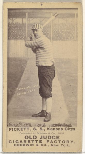 This small card featuring John Thomas Pickett, shortstop for the Kansas City Cowboys, was made by Goodwin & Company around 1888 as part of a series for Old Judge Cigarettes. Printed on thin paper stock, the image’s sepia tone speaks to the photogravure process used to mass produce these cards. The texture is smooth, the result of industrial printing technology. Unlike a handcrafted photograph, the print quality is geared toward quantity and standardization. Goodwin & Company, a cigarette manufacturer, was tapping into the popular appetite for baseball. The company aimed to boost sales, embedding these cards within cigarette packs. This speaks to the increasing commercialization of leisure and sport, with players becoming brand ambassadors. The card represents a tangible intersection of labor, sport, and consumption. It reminds us that even seemingly innocuous collectibles have complex origins in the workings of capitalism.