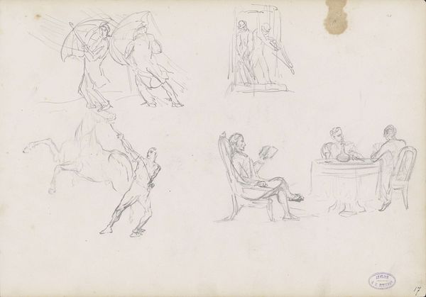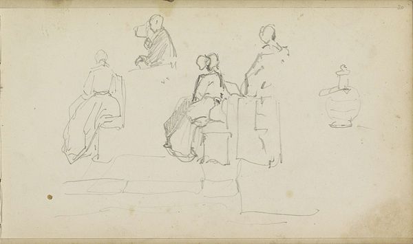 This is a drawing by Johannes Bosboom, who lived in the 19th century, of seated figures who are presumably on church benches. The drawing is done in pencil, a relatively new medium at the time, made possible by industrial advances in graphite mining and wood milling. Pencil allowed artists to create preliminary sketches, capturing fleeting impressions and ideas. The quick, light marks and sketchy lines suggest a sense of immediacy and spontaneity. You can almost see Bosboom's hand moving across the paper, swiftly capturing the essence of the scene before him. This directness was contrary to the highly worked-up surfaces and elaborate techniques of academic painting. Instead, the rough quality and casualness point to a shift in artistic values during the 19th century, as artists increasingly embraced a more informal, personal approach to art-making. We can appreciate how Bosboom has given the drawing a loose, unfinished quality, prioritizing the act of observation over technical polish. By focusing on the creative process and the artist's direct engagement with the subject, we can see how this drawing blurs the boundaries between sketch and finished work.