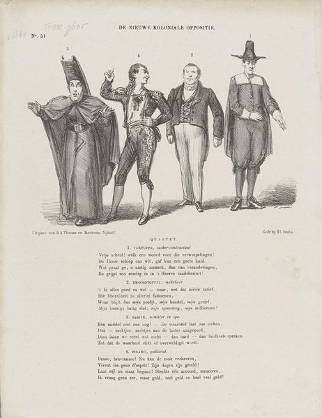 Curator: This print, "The Wolf Pleading Against the Fox, in front of the Monkey" comes to us from J. J. Grandville, and was produced between 1833 and 1843. You can find it here at the Metropolitan Museum of Art. Grandville was a master of lithography. He used the medium for illustration as biting social commentary, often through anthropomorphic figures. Editor: Anthropomorphic indeed. Look at this lineup! It’s a wonderfully strange image. So formal and yet utterly absurd. It has a slightly grim mood with undertones of some twisted fable. Curator: Grandville uses the popular animal fable, a type of storytelling extremely popular since the Medieval era, as a structure. If we look closely at the textural variety achieved through the lithographic process, you can see he creates a clear distinction in social standing through his use of costuming and scale. Notice the ragged fur and smaller stature of the wolf. The precise, tailored suit of the fox suggests the artist used varied techniques to describe labor exploitation. Editor: Exploitation is a great point, I’m thinking about how our own expectations color this reading. It is so weirdly dark. Look at the monkey dressed in legal robes acting as the judge! What do you think about how its composition plays with traditional genre painting? The whole scene reads as satirical. I keep expecting something overtly comical, but this just offers this rather cynical, melancholic reflection. Curator: Well, Grandville certainly understood the political implications of print culture at the time, with technological advances allowing the proliferation of images at affordable rates. But did that really allow him the space for political dissidence? Perhaps that’s where the tension in the fable and its cynical presentation lies. Editor: Perhaps it's the very limitations of its means of production that made it so fascinating and emotionally resonant for us now, wouldn’t you agree? Curator: Definitely something to consider. Thank you for that evocative note, that's worth pondering as we move on.