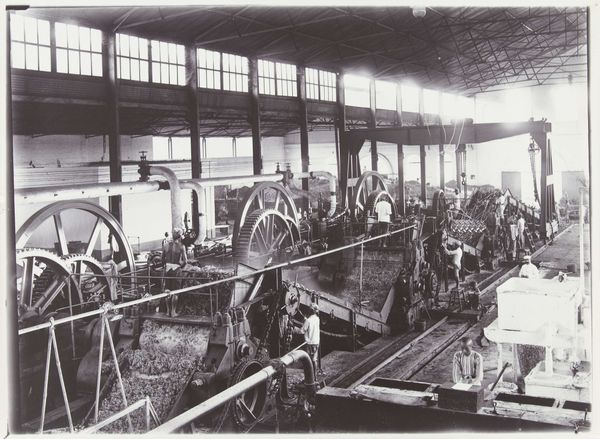 Editor: Here we have an intriguing gelatin silver print, simply titled "Boorinstallatie," placing it sometime between 1903 and 1907. The overwhelming contrast creates a very industrial and almost alienating feel. What catches your eye? How would you interpret its aesthetic choices? Curator: Immediately, the interplay of light and shadow dictates my understanding. The bright exposure washing out the upper portion of the frame acts in stark contrast with the detailed mechanics below. This compositional strategy brings our attention down. This emphasizes the material forms; the cold, metallic machinery rendered with impressive detail by the gelatin silver process. Notice the strong verticals - posts, pipes - creating a structural rhythm. How does that repetitive element strike you? Editor: It almost creates a sense of being caged in, perhaps representing the workers trapped in their labor. Curator: An astute reading! A Formalist analysis steers us toward appreciating the internal visual relationships first. We might also consider how the photographer uses texture – the rough-hewn wooden planks against the smooth metal surfaces - to enhance the sense of depth and dimensionality. The gaze dances through contrasting textures; how they relate, both spatially and visually. Editor: It's true, I'm drawn into that very texture, even though the bright spots obscure what's beyond. It seems almost deliberate now, doesn’t it? To keep our focus. Curator: Precisely! By controlling the light, and shadow, the photographer manipulated our attention to focus on this intricate machinery. A strong example of utilizing contrasts in material to generate aesthetic interest and deeper reflections. Editor: I see it now! Paying attention to the pure form yields a richer interpretation of depth, structure, and texture within the work itself. Curator: Agreed! By understanding this image's internal aesthetic choices, its arrangement, tone, and texture, one can begin to appreciate the photograph itself as an object of artistry and visual engagement.
