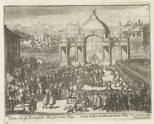 This engraving depicts a triumphal arch erected for the Hoogstraat in The Hague in 1691, created by an anonymous artist. The composition emphasizes a central, linear procession moving towards the arch, flanked by dense crowds. The arch itself, adorned with panels and topped with statuary, serves as a focal point, framing the perspective. Notice how the graphic medium and the artist's technique render a detailed yet somewhat flattened space. The formal structure invites semiotic interpretation. The arch, a symbol of power and victory, is deliberately placed to control the flow of people, underscoring the relationship between authority and the populace. The lines of perspective converge at the arch, guiding the viewer's eye and reinforcing the intended message of order and dominance. Consider how the use of line and form communicates power and control within the context of late 17th-century Dutch society. These elements work together to project an image of a structured, hierarchical world. Yet, interpretations of art are never fixed, but evolve with time and context.