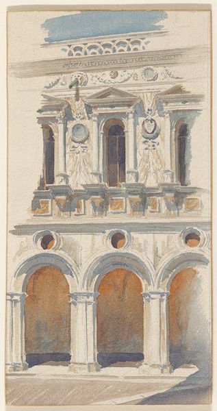 Curator: Oh, I’m immediately drawn to this drawing, it feels like a Piranesi fever dream! Editor: Indeed! What we're observing is a piece entitled "Architectural Fantasy," created by Mauro Antonio Tesi. This mixed-media work, employing drawing, ink, colored pencil, and print on paper, embodies the Baroque style. It’s held here at the Art Institute of Chicago, allowing us to marvel at its exploration of form. Curator: "Fantasy" is the right word, I think. The lines are so restless, like the architecture itself is breathing. The perspective bends in unexpected ways, and my eye bounces all around searching for a place to land. Editor: Precisely. Tesi masterfully utilizes line, a defining element of Baroque aesthetics, to create dynamic movement. Observe the geometry. How the arches, columns, and various structural components establish a complex interplay of forms—a semiotic dance of order and controlled chaos. Curator: Chaos for sure! You know, there's almost a childlike quality to the frenetic mark-making. As if he's sketched his vision down quick before it floats away. Though "childlike" meets Roman ruins! It's also pretty incredible how much depth he creates using, really, mostly line. Editor: His economy of line serves a distinct purpose. It focuses our attention on the essence of form and structure. The limited use of color subtly guides our perception, allowing the architectural lines to take center stage. The contrasting verso, titled "Architectural Details," furthers this focus on line, offering us minute articulations of structural elements that serve to reinforce Tesi's structural investigations. Curator: It’s funny. Looking at this makes me feel tiny, yet powerful. I guess that's the appeal of Baroque, right? Grandeur with an invitation. Like the door is always open to get lost in its intricacies, inviting you to become one small but significant part of it all. Editor: Precisely. We are positioned as active participants in Tesi’s vision. By exploring the form and style, as Tesi implores, we expand the capacity to explore how line impacts our emotional landscape when encountering spatial relationships, and invites new relationships between perception, experience and understanding. Curator: And really, who doesn’t want an open invitation to their own magnificent landscape? Editor: It does beckon. Indeed, perhaps our encounter with Tesi will linger as we each construct our personal experiences within architecture of all kinds.