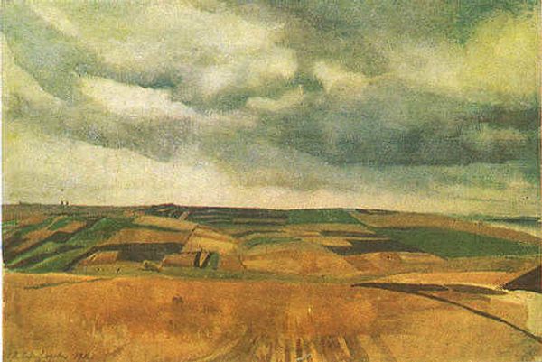 Curator: Standing before us is Zinaida Serebriakova’s 1916 oil on canvas, "Landscape. Village Neskuchnoye.” The scene presents a broad, gently rolling countryside beneath a dramatic sky. Editor: My first thought is how serene this landscape feels. The soft palette and open composition suggest a peaceful existence, a retreat perhaps from the increasingly turbulent world outside. Curator: Indeed. Serebriakova, a woman artist working within a patriarchal society, often depicted scenes of rural life, offering a counterpoint to the dominant narratives of war and revolution during that era. Consider the materiality of the paint itself. The artist lays down layers of colour with palpable energy and care. It speaks to the labor and the means of creating this imagery. Editor: And it prompts us to consider what this ‘retreat’ really signifies. Neskuchnoye, meaning ‘not boring,’ seems almost ironic in light of the relative inactivity depicted here. This painting invites questions about women’s roles during this pre-revolutionary period in Russia, whether this apparent quietude represented liberation, constraint, or simply the circumscribed realities of daily existence. Curator: Look at the way Serebriakova handles light and atmosphere; that is pure plein-air technique at its best. The brushstrokes themselves become a kind of topography, echoing the cultivated fields. Editor: Yet I’m struck by the social dynamics not present. The artist is painting the backdrop against which village life unfolds, but not life itself. The missing laborers hint at their erasure within idealized landscapes, suggesting a disconnect between the art and the lived experiences of the workers who shaped this countryside. It becomes a political act to bring the viewer's attention back to those untold stories and to critically examine how these rural communities sustain and get sustained. Curator: It's the handling of light that draws me in—how it bathes the fields, highlights the architecture in the distance, and then disperses into those gorgeous cloud formations. This work resonates precisely because the process becomes almost visible, highlighting an honest capture of rural scenery. Editor: Thank you. For me, this has become a meditation on absence as much as presence, raising complex questions about landscape, labor, and visibility in pre-revolutionary Russia. Curator: Precisely. Serebriakova’s material engagement transforms a traditional landscape genre into something deeply considered, inviting reflection on not just what is visible, but what sustains it.