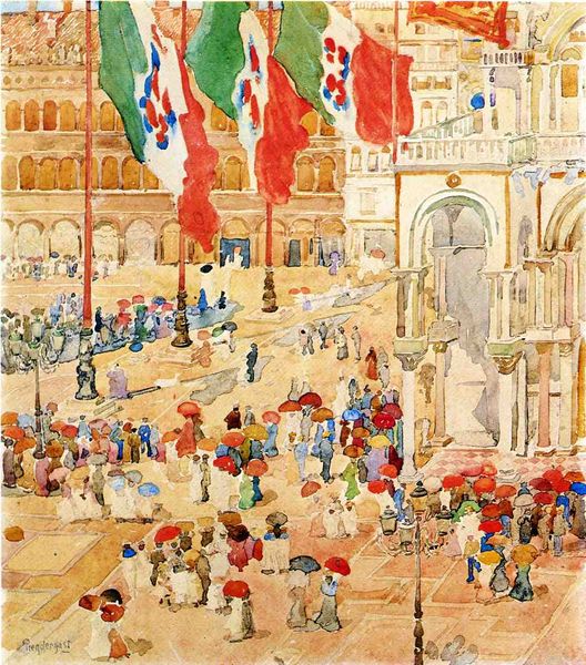 Editor: We’re looking at Maurice Prendergast’s "Splash of Sunshine and Rain," painted in 1899, probably using watercolor and maybe some other media. I'm immediately drawn to how the artist captures the energy of the crowd and the vibrant colours. The flags lend a patriotic feel. What kind of story do you think this image tells? Curator: It speaks to me of a potent intersection between the sacred and the secular. Flags, traditionally symbols of nationhood and power, dance alongside the majestic architecture of what appears to be a Venetian cathedral. Ask yourself, what does it mean to drape a place of worship with the emblems of earthly rule? Does it honor, or perhaps subtly undermine, the spiritual significance of the space? Consider, too, the people. They are depicted almost as an extension of the architecture, contributing to an overwhelming impression of ritual, purpose and festivity. Editor: I see what you mean about the layering of symbolism. I hadn’t thought about the potential tension between church and state playing out there. Do the red parasols signify something specific? Curator: Parasols in art are frequently markers of status, connoting the leisured classes and notions of refined femininity. Here, Prendergast might be hinting at the social stratification of Venice, subtly imbuing the scene with societal narratives. But it is also fair to recognize them as objects reflecting color and diffusing light: do they stand only for their cultural implications, or might Prendergast have had a formalist eye in painting this? Editor: That’s a great point – it can be about both, right? I will look more closely at the artist’s composition and how shapes can become signals for meaning. Curator: Indeed. Never forget that every artistic choice, from the grandest architectural element to the humblest parasol, has the potential to resonate with cultural weight, speaking volumes across time.