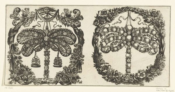 Curator: This work, "Juwelen in cartouches", comes to us from Daniel de Lafeuille. We estimate it was created sometime between 1650 and 1709. Editor: Well, my immediate thought is...frivolous, but in a meticulously rendered way. It's delicate and quite striking, like looking at blueprints for some fantastically expensive chandeliers. Curator: Precisely. De Lafeuille specialized in these kinds of decorative prints, very much in line with the Baroque obsession with ornamentation. What strikes me is how these aren’t just representations of jewels, they are symbolic constructions. Each grouping feels intentional. Editor: The cartouches do seem carefully balanced, almost heraldic. It's interesting how these designs use flowers and ribbons—symbols of status that also soften the potentially harsh geometry of the gemstones. The squirrels in hammocks seem a touch whimsical though, considering the rest. Curator: Don't dismiss the squirrels too quickly! Squirrels symbolize resourcefulness and provision. By embedding them with these symbols of wealth and status, de Lafeuille could be making a comment on how virtue—such as hard work—might underpin material success. Consider that engravings like these weren’t simply aesthetic; they circulated ideas about wealth and morality, influencing elite tastes and self-perception. Editor: That adds a layer, certainly. Thinking about it in a broader context, these weren’t just idle doodles. They served as templates, ideas that could be adapted for furniture, jewelry, even architecture, filtering down into wider visual culture and affecting popular conceptions of luxury. Curator: Precisely. It speaks to the function of prints during the period, how they helped spread visual trends. It makes me wonder, were these accessible to everyone? Or was it specifically catered towards certain elite artisans and patrons, spreading notions of power only within very exclusive circles? Editor: A fascinating question. It raises the specter of exclusivity again, framing even ornamentation as a tool of social distinction. Overall, I find the drawing is intriguing – there's more happening than initially meets the eye. Curator: Indeed. These prints reveal how seemingly straightforward decoration operated within complex networks of meaning, commerce, and societal ambition.