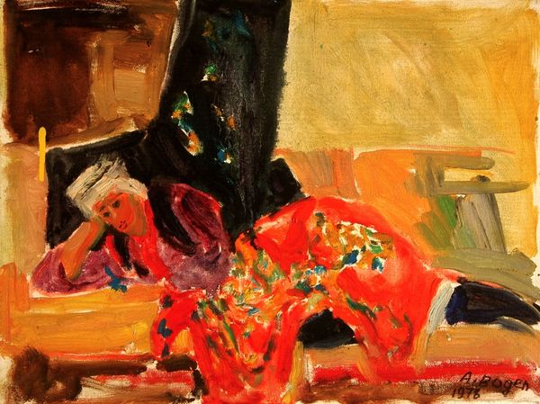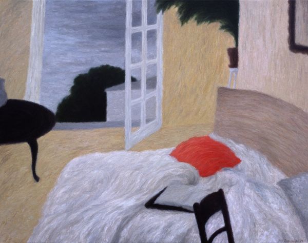 Editor: So, this is Henri Matisse's "Woman With a Book" from 1919, an oil painting. There's something about the way the vibrant colors almost clash yet still feel harmonious, that I find fascinating. What do you see in this piece? Curator: Immediately, I am drawn to the interplay between interior and exterior space. Notice how the open window doesn't just frame the outside world but seems to invite it in, almost as if the beach scene is another symbolic element within the room itself. It is tempting to link the figure of the reader to those silhouetted against the seashore horizon. Are they related symbolically? What might reading offer to both the painted subject, and Matisse's broader audience? Editor: That’s a really interesting point. I hadn't considered how the window kind of merges the two spaces. Curator: Matisse repeatedly returned to the reader, often an artistic muse or companion. The figure of the woman with the book in many ways seems symbolic of access to the aesthetic, domestic interior Matisse so excelled at depicting. The book then acts as a portal for further symbolic ingress and egress. Do you notice any repeated motifs or colors, and might that have any symbolic meaning? Editor: The blue and white stripes are definitely repeated on the bedsheets and in the woman’s robe... almost echoing the beach scene, as if she's enveloped in the seascape? Curator: Precisely. Colors are often tied to emotions or memory, creating connections within the image and to the viewer's cultural memory. Consider how Fauvism, with its bold and non-naturalistic colors, often sought to express inner emotional states rather than objective reality. Editor: That makes a lot of sense. Seeing how he uses color to connect different elements gives me a whole new perspective. Curator: Indeed, visual symbolism lets us excavate the rich emotional and cultural layers embedded in Matisse's work. This piece continues to pose intriguing questions.