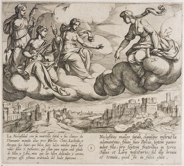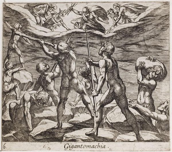Editor: This is Antonio Tempesta's "Arethusa Chased by Alpheus," a small etching. There's a real sense of frantic energy here. What stands out to you in this work? Curator: I see a potent visual representation of power dynamics, particularly male pursuit and female flight. How does the mythological context, the nymph Arethusa fleeing the river god Alpheus, resonate with contemporary discussions around consent and bodily autonomy? Editor: So, you're seeing this pursuit as a historical parallel to modern issues? Curator: Exactly. Tempesta's work, through a contemporary lens, prompts us to question the normalization of unchecked pursuit and the violation of personal space that echoes through centuries of art and culture. The cloud seems to both hide and reveal Arethusa. Editor: That makes me look at the image so differently. Thanks! Curator: It’s a dialogue between then and now. Food for thought!