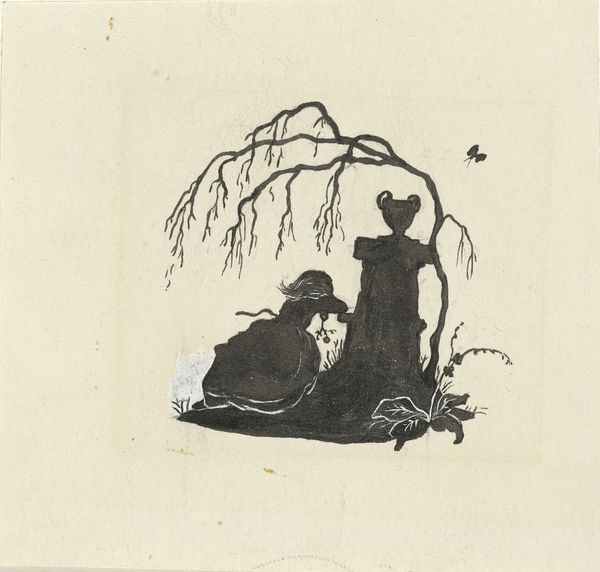 Editor: Here we have Lucien Pissarro's wood engraving, "April," showing a mother and child beneath a tree. It has a stark, almost fairytale quality. What's your take on this scene? Curator: It reminds me of those quiet moments in childhood, a bit melancholy maybe? Pissarro’s technique really shines here, doesn't it? Notice how the dense black ink creates such strong contrast, almost like shadows in a dream. What do you make of their postures? Editor: They seem to be in quiet contemplation, or perhaps just weathering a storm together. I hadn’t considered the shadows before, now I see a deeper story. Curator: Exactly! And that’s the joy of art, isn't it? Finding new stories in old lines.
