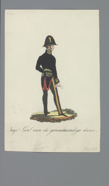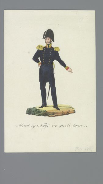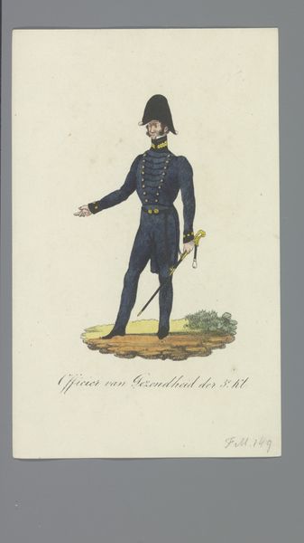 This watercolor painting, Invalide, was made by Albertus Verhoesen in the 19th century. The figure stands in military dress: tall hat, sword and formal jacket. The sword, a recurring motif throughout art history, symbolizes power, justice, and military honor. But here, it hangs sheathed, a dormant emblem of potential force rather than active aggression. Think of the Archangel Michael, frequently depicted with a sword, a symbol of divine authority and righteousness. Yet, in this image, the sword's symbolism is muted, perhaps even inverted. The figure's stance is static, the setting minimal. The sword, though present, does not define him; instead, it hints at a past, a duty perhaps unfulfilled or completed. This contrast invites reflection on the psychological weight of military service. The sword becomes a poignant reminder of the soldier's presence. A symbol that transcends mere representation.