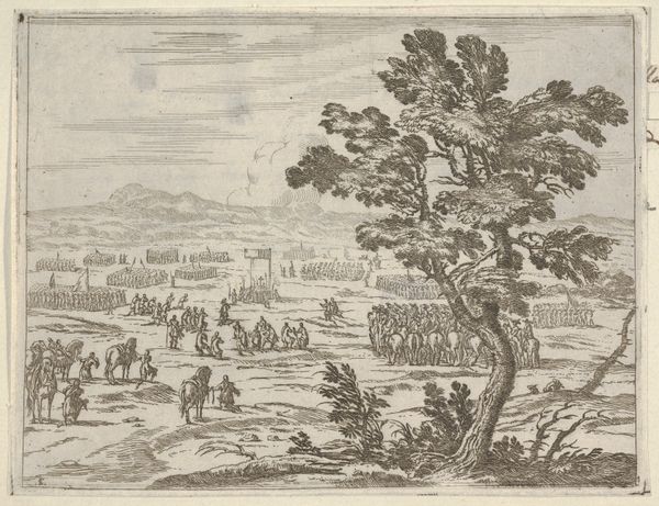 Editor: So, this engraving from 1659 by Bartolomeo Fenice. The full title is a mouthful: "Francesco I d'Este Secures the Fort and the Land to Protect from the German Troops, from L'Idea di un Principe ed Eroe Cristiano in Francesco I d'Este, di Modena e Reggio Duca VIII." It feels… staged. Everyone’s posed, even the horses. What are your initial thoughts about it? Curator: I'm immediately drawn to the engraving technique itself. Consider the labor invested in the precise, repetitive marks required to build this image. How does the process of engraving, with its emphasis on linear detail and reproducibility, shape our understanding of Francesco d'Este’s power? It wasn't just about illustrating a heroic deed; it was about manufacturing an image, circulating a specific narrative. Editor: Manufacturing… you mean like propaganda? Curator: Exactly. Look at the meticulous depiction of the soldiers, the controlled landscape, the orderly procession. The very act of creating and distributing prints like these was a way to solidify Francesco's image and authority. How did the mass production and circulation of images like these impact early modern notions of power and legitimacy? Think of it as image crafting through meticulous, reproducible labor. Editor: I never thought about the "copying" aspect like that before. I was too focused on what it depicted. So it’s less about what we see and more about how it was made, and distributed? Curator: Precisely! What does this print *do*, rather than simply *represent*? What kind of material networks made its creation possible? It tells us just as much about early modern manufacturing and political maneuvering as it does about military exploits. Consider how this "material" perspective helps us redefine value. Editor: That makes so much sense! It gives the image a completely different, almost… modern spin. Thanks! Curator: My pleasure! Looking closely at the materiality of art can provide a fresh lens to analyze historical narratives.