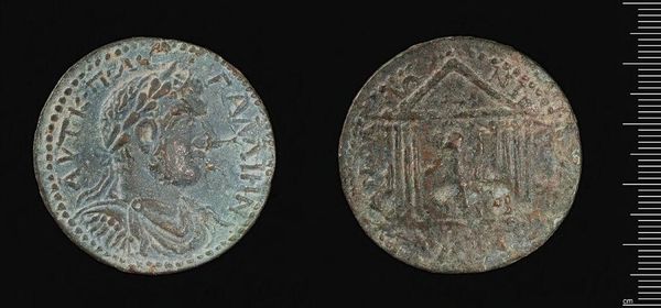 Editor: Here we have a coin of Berytos under Elagabalus from the Harvard Art Museums. The details are incredible, even on such a small, aged object. What strikes you when you look at it? Curator: The incuse relief presents a fascinating study in form. Note how the artist manipulates positive and negative space to articulate the imperial portrait and architectural details. The very act of impressing such designs onto metal imparts a unique aesthetic. Editor: So the process itself is key to understanding it? Curator: Precisely. The physicality of striking the coin, the resulting textures, all contribute to its visual language. Consider also how the coin's circular form dictates and contains the composition. What have we learned? Editor: I see the skill involved now, and the artistic decisions behind what seems like a simple object.