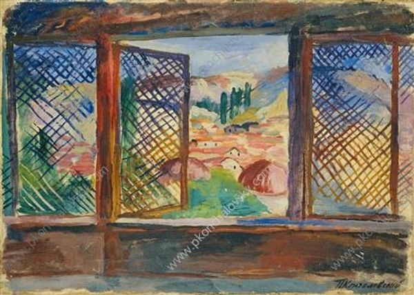 Curator: Patrick Procktor’s “Cataract, Aswan,” created in 1985, gives us a glimpse into a specific time and place, refracted through the lens of orientalism. Editor: My immediate reaction is to focus on the contrast in this piece. The architectural rigidity and repetitive motifs versus the soft, dreamlike landscape beyond. It almost feels staged. Curator: Indeed. Procktor, who was openly gay, travelled extensively, often drawing inspiration from his experiences in the Middle East. It's fascinating how the painting acts as a kind of window onto both a real landscape and a constructed fantasy, one shaped by Western perspectives. Editor: I see those "constructed fantasies" expressed particularly well in his use of watercolor, traditionally associated with the ephemeral. Here, it layers onto a scene implying colonial travel, and the exotic “other”. It's not only about capturing a location but also conveying particular expectations related to production and its effect on the viewer. Curator: Exactly! By using watercolor en plein air, Procktor inserts himself directly into this history of orientalism. The artistic process itself becomes a commentary on how Western artists engaged with and interpreted these cultures. It begs us to consider power dynamics and representation. Editor: The materials tell a tale here. I’m particularly interested in the relationship of shadow and light created via architectural interventions. How would the local craftspeople have viewed the use of such architectural ornamentation? Where would he source the materials? Who built it? These factors inform his position of privilege, both financial and cultural. Curator: And the shadow cast could allude to this complicated position as an outsider, which speaks to the ongoing dialogue of appropriation. The light, airy strokes used to depict the landscape almost seem at odds with the heavily patterned screen that partially obscures the view. Editor: So, the work highlights cultural exchange while calling attention to artistic choices embedded within material realities, echoing historical narratives and production conditions? It’s a fascinating challenge to prevailing orthodoxies. Curator: Agreed. I'd add it presents us with an image steeped in aesthetic beauty while simultaneously confronting us with the complex and sometimes problematic history of artistic interpretation and cross-cultural engagement. Editor: Absolutely. "Cataract, Aswan" really brings forth a tension between observation and construction, making you appreciate Procktor’s work that goes beyond surface level.