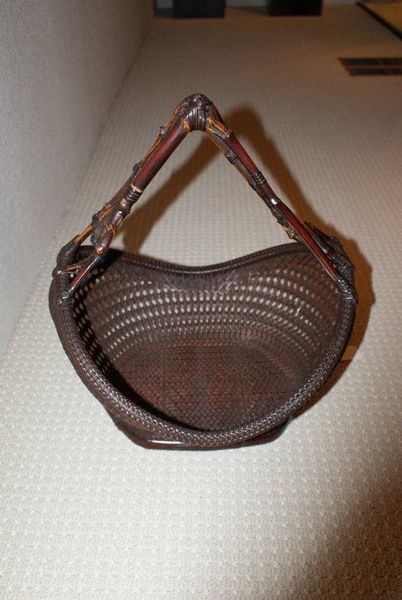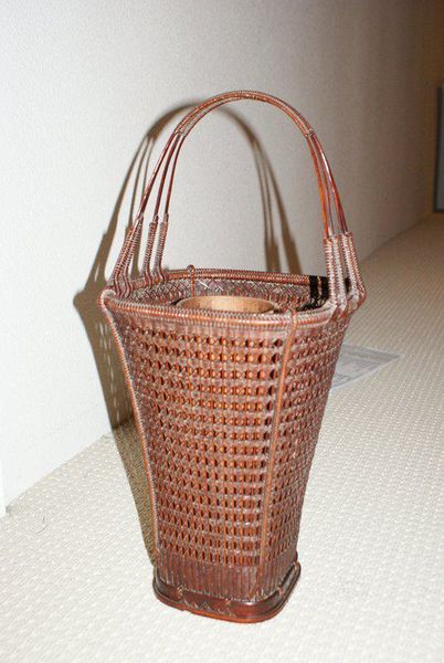 Editor: This lovely "Footed Flower Basket," possibly from 1929, was crafted by Maeda Chikubōsai, utilizing wood and ceramic. The craftsmanship feels very detailed; what can you tell me about this particular piece? Curator: Examining the basket from a formalist lens, one is immediately struck by the texture and the structural integrity achieved through weaving. The interplay between light and shadow created by the woven bamboo constructs a complex visual experience. How does this structure inform the artwork as a whole? Editor: It feels simultaneously rigid and delicate. It’s sturdy, but the gaps in the weave create a sense of lightness, preventing it from feeling too bulky. Do you think the negative space has a significant role? Curator: Indeed, the negative space is integral. Consider it not just as emptiness, but as an active element participating in the definition of form. The lines, intervals, and overall pattern are essential. It contributes to a sense of permeability and depth. This basket is an exploration of geometric rhythm, isn’t it? Editor: It absolutely is! There is something comforting in the symmetry. Could this basket transcend its function and be seen as sculpture? Curator: That’s insightful. The functionality of this flower basket does not detract from its artistic merit, especially as it challenges preconceived notions. Editor: Looking closely, the uniformity and precise detailing seem integral to the overall form, I notice more intricate layers with each viewing! Curator: Precisely. Form triumphs, making way for contemplation. This emphasis isolates our awareness of texture, volume, and light. What initially seems plain reveals hidden sophistication in materiality and configuration. Editor: That’s a completely different way of approaching and seeing it! I am so glad I know about it.