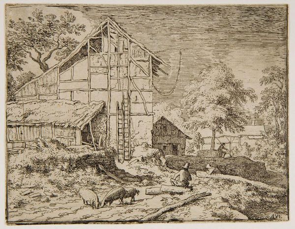 Editor: This etching, "Farmyard Scene with Man Plowing" by Will S. Taylor, dated 1945, depicts exactly what the title describes! The sky, created using incredibly fine and subtle lines, dominates the top half of the print and certainly sets a rural, slightly somber tone. What's your reading of this scene? Curator: You know, the somber tone gets me thinking about the 1940s, the Second World War casting a long shadow. This print is deceptively simple. On the surface, a rural idyll; but, below that surface, could Taylor be subtly hinting at the anxieties and resilience of rural America during wartime? What do you notice about the composition, the relationship between the figures and the landscape? Editor: I see a stark contrast between the detailed foreground with the farmer and his oxen, and the somewhat sketchier, almost dreamlike quality of the background elements such as the barn and haystack. It almost feels like two different worlds coexisting in the same picture plane. Curator: Exactly! And consider the weight of the sky bearing down on that tiny human figure and those two steadfast oxen. Isn't it interesting how he uses the texture of the etching to almost make the land feel… pregnant? Almost like a metaphor of nurturing, or cultivation, or hard-fought resilience in the face of really uncertain times? Almost a sacred pact. Editor: I hadn't considered the tension of that! Thanks for helping me look at it in a fresh way, reflecting on a potential weight the figure in the foreground has to overcome and what it represents more broadly. Curator: And thank *you* for sharing your perceptive insights! Art's a conversation, not a lecture, eh? Now, let’s find another hidden gem, shall we?