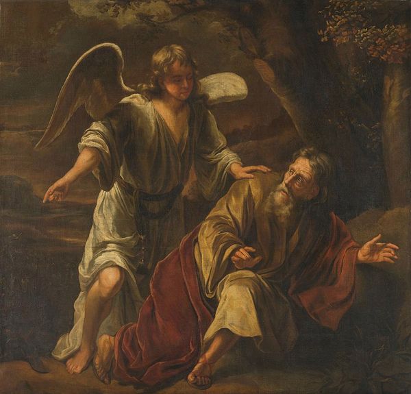 Editor: This is Gerard van Honthorst’s *Christ in the Garden of Gethsemane,* painted in 1617 using oil paint. There's such a strong sense of drama in this piece. The figures are so dramatically lit against the dark background. How do you interpret this work, focusing on its visual language? Curator: This particular scene, often rendered, offers rich symbolic weight. Notice the angel and Christ—their illumination isn’t just dramatic, it guides our understanding. Consider the cloud the angel rests upon: a common visual device signifying divine presence, but also a place of mediation between the divine and earthly realms. How does it make you feel? Editor: Peaceful, almost… otherworldly. Like they exist in a separate space, defined by light, from the rest of the dark, undefined area behind them. Curator: Exactly. The sharp contrast isn't only visual; it is designed to provoke deep introspection. Light and shadow become visual metaphors. What about the color? The use of red draws my eye. What do you see? Editor: It stands out so much against the darkness. It almost feels like a warning sign... given the context of the scene, maybe it refers to sacrifice or maybe blood? Curator: Precisely! This symbolic connection persists over time. Consider how in various cultures, red represents vital life force. Honthorst utilizes color here to cue into layers of pre-existing, widely recognized imagery and cultural meaning. It certainly made its mark on me. Editor: This has helped me to see beyond the initial drama and start thinking about these enduring symbols, and it makes the work resonate differently. Curator: Me too! It's exciting to see old artworks in new light. I had fun seeing these artworks through the fresh perspectives of art students, as they encourage new reflections and perspectives.
